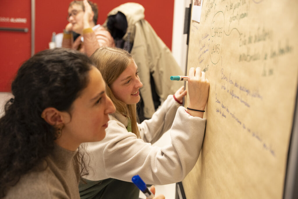 Les animatrices, à partir des cartes mentales, réalisent une synthèse à l’oral de ce qui a été dit durant l’atelier. Ainsi, elles s’assurent auprès des participant·e·s qu’il n’y a pas eu d’oubli concernant leurs idées.