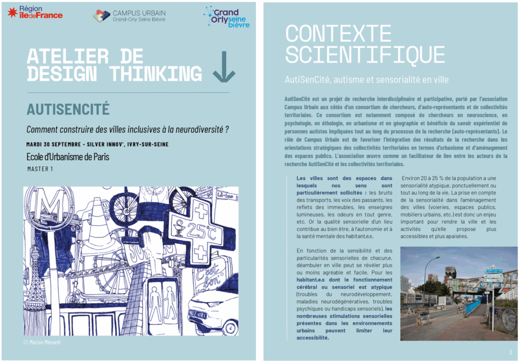 L’équipe de Campus Urbain anime des ateliers participatifs autour des caractéristiques sensorielles des personnes issues de la neurodiversité et des solutions pour améliorer leur quoditien en milieu urbain. Ces ateliers peuvent être déclinés pour différents publics (services municipaux, maitrise d’ouvrage, citoyens citoyennes, équipes de structures territoriales, etc). L’objectif étant de sensibiliser sur ces enjeux et de co-construire des solutions en fonction des expertises de chacun pour répondre de façon adaptée et réaliste aux besoins spécifiques du lieu.